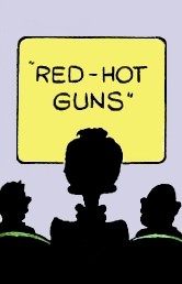 On arrival Donald holds up the badman, who demands a fair fight. Donald replies while holstering his six-guns: Okay! I'm no coward! Rimfire Remington always does this in his pictures! Blacksnake immediately shoots Donald through his holsters: Swell! But Rimfire Remington can shoot faster than you can, punk! And so can Blacksnake McQuirt! |