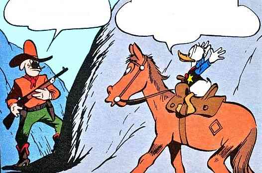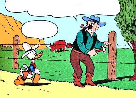 After having outgunned Donald Blacksnake rides along singing: I'm an old cowthief and I loves my beef! Barks refers to an old standard titled I'm a Old Cowhand from the Rio Grande. A bit later Blacksnake continues merrily: I'm an old cowpoke, an' I loves my joke! |