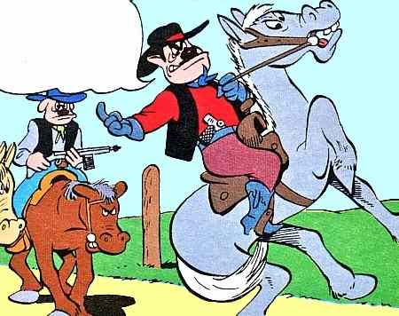 From the start of the story Donald sees himself as a heroic lawman. On meeting the local sheriff for the first time he is being turned down as a helper, though. His reaction: That's what they told Sagebrush Savage in the picture 'Blistering Bullets', but he cleaned up the gang singlehandedly. And in 'Gunsmoke Gulch' Wild Bill Carson trapped sixty rustlers in a box canyon! |