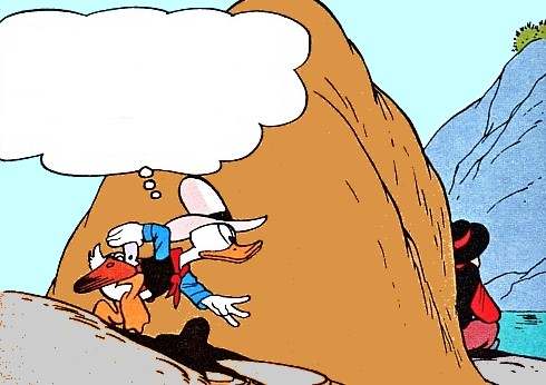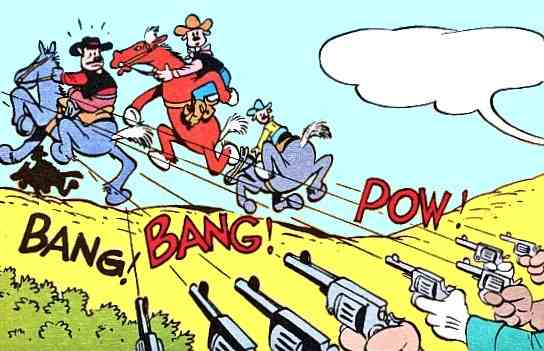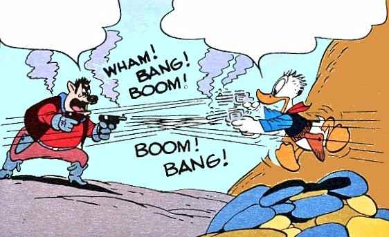 A fierce gunfight ensues during which Donald manages to fire at least 17 rounds with his two six-guns without reloading, while yelling: Move around so you'll get in the way of my bullets! After having forced Blacksnake on a hasty retreat Donald's very potent six-guns run dry: That never happened in Trigger Trueshot's pictures! |