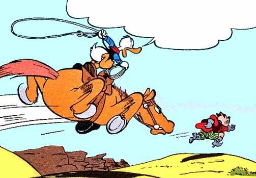 Donald rides out for a showdown with Blacksnake McQuirt, the chief rustler: Reminds me of the chase sequence in 'Powderburns on the Powderhorn'! |