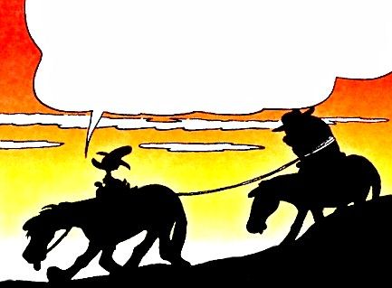Narration: In the glow of the Western twilight, two horsemen ride from the shadows of the terrible badlands! |