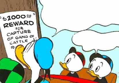 Donald happens to find the rustled cattle furnished with new branding marks: I saw the same trick in the picture 'Shuddering Saddles'! Stumpalong Hoppity brought the culprits to justice! |