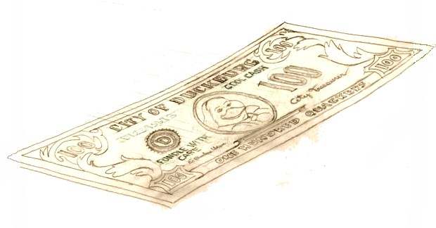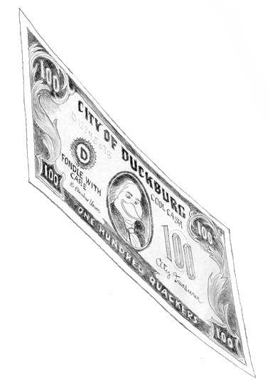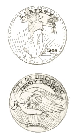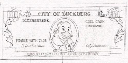 In the same period of time Barks toyed with the interesting idea of issuing a special currency for the city of Duckburg, and below you are treated to a few of his preliminary sketches. There is no saying of the value of these Quackers and Ducats compared to Dollars and Cents, but if the newly invented currency equals the normal American currency, Scrooge McDuck's status as the world's richest duck is not in peril...