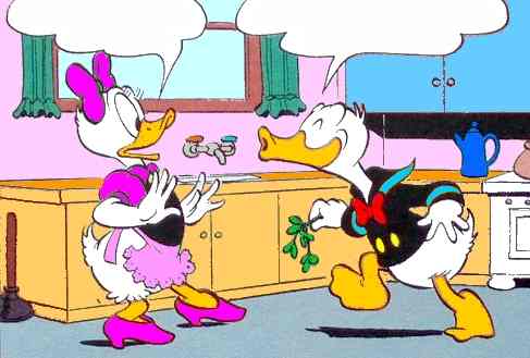1951 FC0367 Donald tries to exorcize his right to kiss Daisy under a mistletoe, but she outsmarts him! |