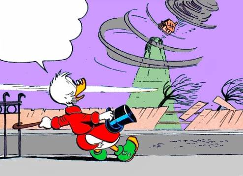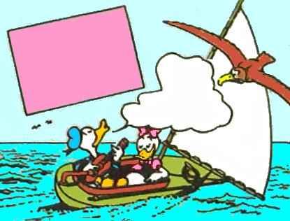 HERE). In U$44 Crown of the Mayas a lengthy, historical narration begins: Two thousand years ago, a jittery Mayan Emperor tossed his jeweled crown into a creepy 'Well of Sacrifice'! ... In WDCS139 'The Racing Pigeon' Barks gets all lyrical describing first Donald's feelings and then the nephews': In the spring, a young man's fancy lightly turns to thoughts of... - In the spring, young boys' fancies lightly turn to raising beasts and fowls! In WDCS143 'Gems in the Desert' Barks uses slightly pompous narratives during the story. Here are the first ones where Donald and Gladstone are described in fairy taleish phrases: If this were a fairy story, it would begin: Once upon a time there was a great King of Luck! He was so lucky that nothing bad could ever happen to him! - Among the great king's fellow mortals was a lowly cousin who was very jealous of the king's good fortune! He wished that he could outdo the king just once! In WDCS187 'Two is Company' Barks sets the scene for the upcoming tumultuous events with a few ominous words: It's an ill wind that blows nobody good! And in the spring when the winds blow and blow, who's to know what will come riding down the wind into his life? |