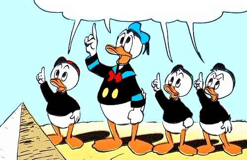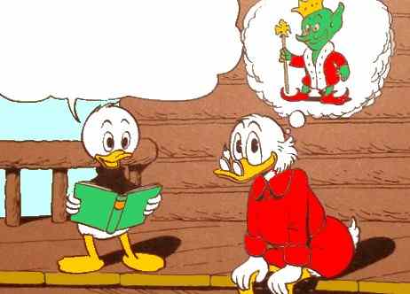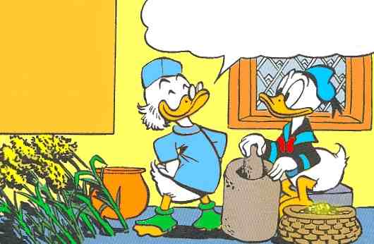 Barks only used proverbs to enhance passages in his stories, and it just happened on rare occasions. Here are some examples: In U$25 'Pyramid Hunt' Scrooge uses a proverb as his mantra throughout the story. He says: Let the cobbler stick to his last, meaning 'continue doing what you know about instead of trying new things where you are likely to fail'. In the end the Ducks come to the same conclusion. In WDCS103 'The Maharajah's Ruby' Gladstone succeeds in luring the Ducks into digging for a lost ruby on a beach. In the meantime he chants: All things come to him who sits and waits! That's my slogan! In the end the Ducks agree when they manage to find the ruby for themselves. In WDCS155 'The Rainbow Heirs' the Ducks and Gladstone heed the old saying There's a pot of gold at the end of the rainbow, meaning 'it can sometimes be difficult to obtain what you dream to find or achieve'. Barks uses the proverb quite literally by constructing a story in which Scrooge's heirs actually find pots of gold at the end of a rainbow. In WDCS187 'Two is Company' this proverb is used: It's an ill wind that blows nobody any good, meaning 'unpleasant events and difficult situations often have unexpected good effects'. Barks actually uses the phrase right in the opening splash panel and thereby sets the scene for the rest of the story. In WDCS198 'The Costume Party' Donald is invited to a costume party and he dresses up as a knight which proves to be a wise decision, because he actually ends up as a knight in shining armour, meaning that 'a brave man can rescue you from a difficult situation'. In WDCS241 Rocks to Riches Barks' title is clearly fantasizing over the proverb rags to riches, meaning that even if you are poor you will always have the chance to become rich and powerful. Interestingly, he later actually made a ½-pager in WDCS262 titled Rags to Riches. |
