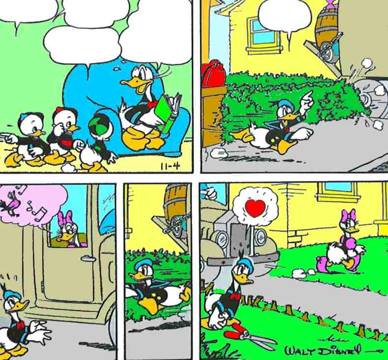 changed to Daisy. In 1938, Al Taliaferro began working on the Donald Duck daily newspaper strips, and two years later, on Donald Duck Sunday pages. In November he introduced Daisy in the comics. |