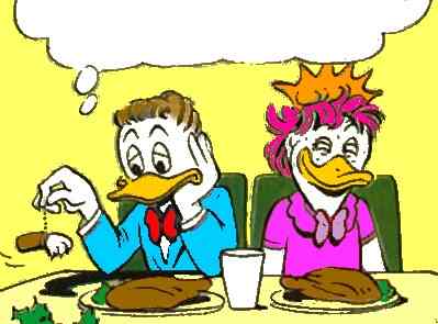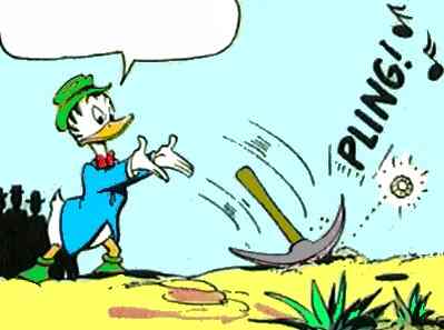 Gladstone is by far the most modified character in Barks' duck universe. In reality, he does not even belong in the duck family. He is portrayed as a goose (like Gus Goose) but it is only his beak that differs from that of the ducks. But as you can see from the few panels below, Barks did, after all, end up giving him a duck's beak. |